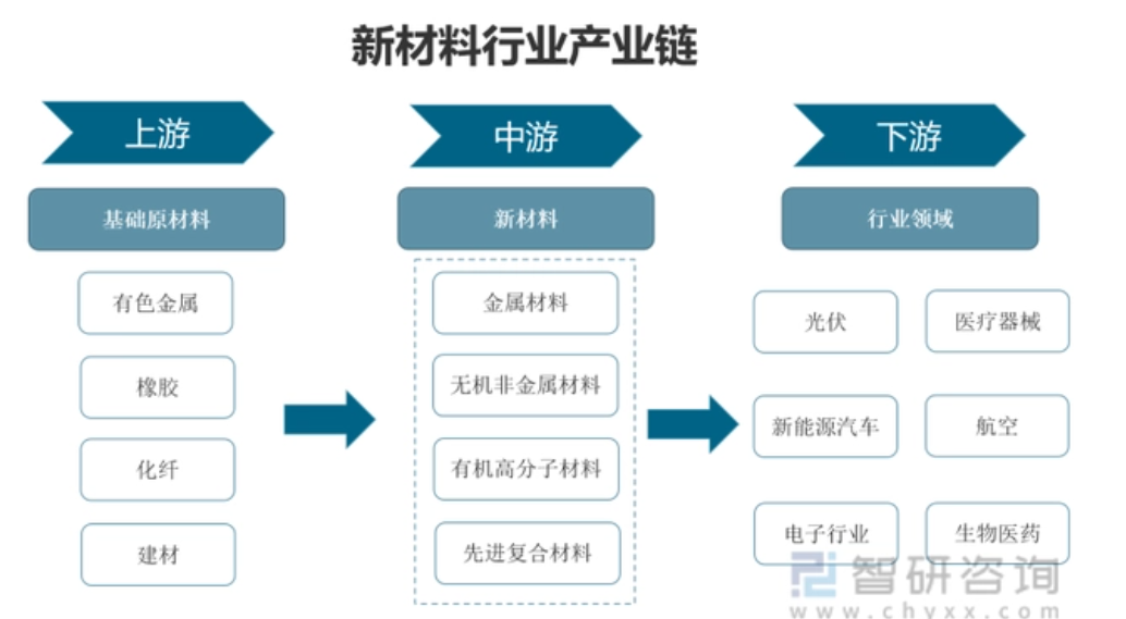 新材料行业上游为一些基础原材料,包含有色金属、橡胶、化纤、建材等。新材料行业中游为新材料按组分为金属材料、无机非金属材料、有机高分子材料、先进复合材料四大类。按材料性能分为结构材料和功能材料。新材料行业下游包含了光伏,新能源汽车、电子行业、医疗器械、航空和生物医药等多个领域。