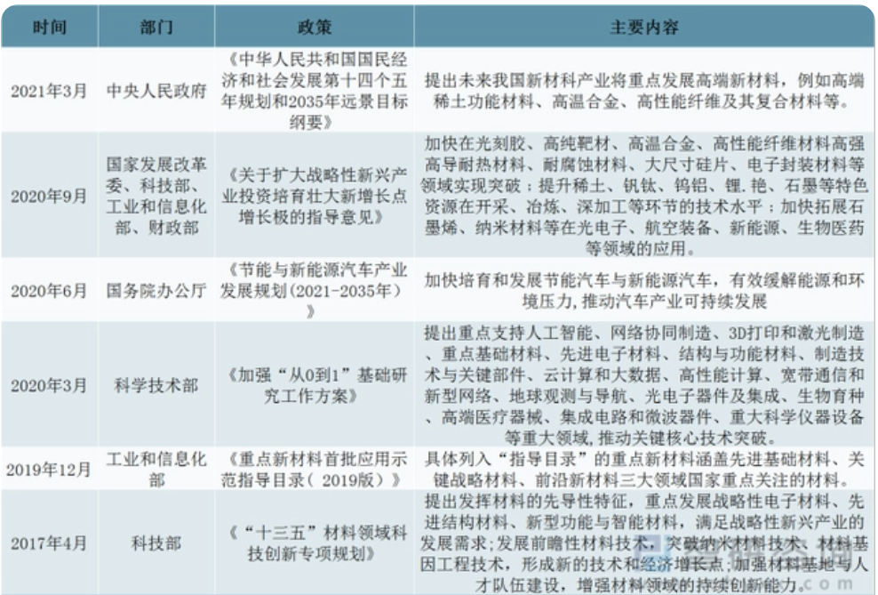 新材料行业部分政策