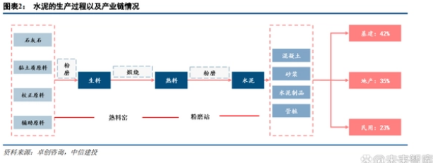 水泥行业为重资产、资源型产业,生产环节包括“两磨一烧”。水泥行业的上游产业主要是石灰石、泥灰岩、 黏土、石膏等材料;下游应用主要在基础设施建设、建筑工程、水利、装修等领域。而水泥生产主要包括三个 环节,生料粉磨、回窑煅烧、熟料粉磨(简称“两磨一烧”)。以石灰石和黏土为主要原料,还会掺加校正原料 或辅助原料,经破碎、配料、磨细制成生料,然后喂入水泥窑中煅烧成熟料,再将熟料加适量石膏、辅助原料 磨细即得水泥。煤既是燃料,燃烧后的灰粉又作为原料成为熟料的一部分。从下游来看,水泥可通过直接以及 水泥制品的间接方式运用于基建、地产以及民用领域,根据卓创咨询数据,2021 年基建领域需求提升至 42%, 成为水泥下游应用最主要领域。