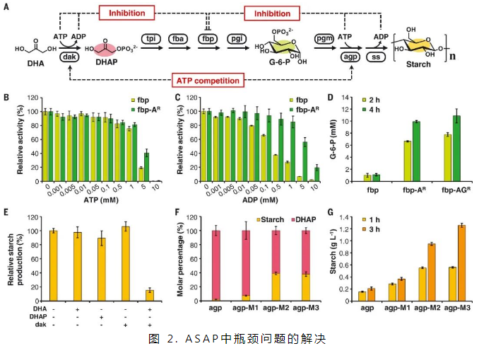 在建立ASAP 1.0之后,研究团队试图通过解决潜在的瓶颈来优化这条途径。首先,由于其低动力学活性,酶fls在ASAP 1.0中占总蛋白质剂量的约86%,以维持代谢通量并将有毒甲醛保持在非常低的水平。定向进化增加了fls催化活性,产生了变体fls-M3,其活性提高了4.7倍。图2B-D表明变体fbp-AR在AMP变构位点包含两个突变,可减轻ADP抑制并显着改善DHA的G-6-P产生。三种核苷酸对fbp和fbp-AR的抑制模式分析表明ATP或ADP是系统抑制的决定因素。通过将fbp-AR与报道的对G-6-P具有抗性的变体整合,组合变体fbp-AGR实现了进一步的改进。考虑到dak和ADP-葡萄糖焦磷酸化酶(agp)之间的ATP竞争,因为底物DHA及其激酶dak的增加导致前4小时内淀粉产量异常降低(图2A)。作者证实DHA和dak的共存通过Cnb严重抑制了淀粉合成(图2E)并输出DHA磷酸盐(DHAP)作为淀粉的主要产物(图2F,第一列),这证实了dak竞争性地消耗了大部分ATP。作者没有减少dak的用量,而是尝试增强agp的能力。根据报道的氨基酸置换,并且这些变体显示出与dak的增强竞争(图2F)。最好的变体agp-M3成功地将DHA的淀粉合成增加了大约六倍(图2G)。通过使用这三种工程酶(fls-M3、fbp-AGR和agp-M3),研究团队构建了ASAP 2.0,它在10小时内从20 mM甲醇中产生了约230 mgl-1直链淀粉。与ASAP 1.0相比,ASAP 2.0的淀粉生产率提高了7.6倍。