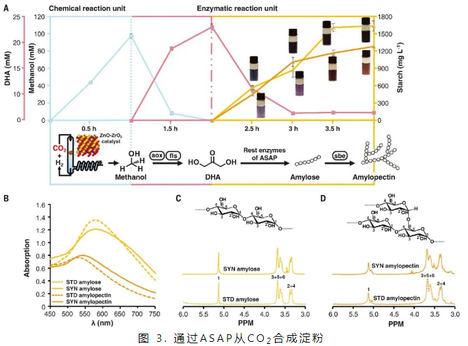 在ASAP 2.0中取得上述成功后,研究团队通过先前开发的无机催化剂ZnO-ZrO2将酶促过程与CO2还原相结合,进而从CO2和氢气合成淀粉。由于CO2加氢的不利条件,研究团队在ASAP 3.0中开发了具有化学反应单元和酶促反应单元的化学酶促级联系统。为了满足fls对高浓度甲醛的需求并避免其对其他酶的毒性,他们进一步用两个步骤操作酶促单元(图3A)。为了从CO2合成支链淀粉,研究团队在ASAP 3.1中引入了来自创伤弧菌的淀粉分支酶(sbe)。该设置在4小时内产生了约1.3 gL-1支链淀粉(图3A)。合成支链淀粉在碘处理后呈红棕色,吸收最大值与标准支链淀粉相当(图3B)。合成的直链淀粉和支链淀粉都表现出与其标准对应物相同的1到6个质子核磁共振信号(图3C、3D)。