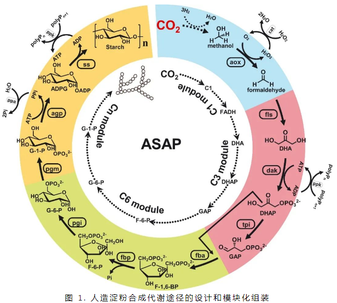 淀粉是“粥饭”中最主要的碳水化合物,是面粉、大米、玉米等粮食的主要成分,也是重要的工业原料。目前主要由玉米等作物通过光合作用固定二氧化碳产生。这个过程涉及大约60个生化反应以及复杂的生理调控。该工艺的理论能量转换效率仅为2%左右。