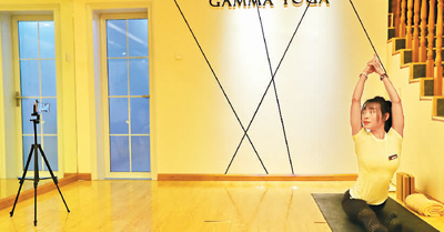 位于河北省秦皇岛市海港区的一家瑜伽会所内,瑜伽教练正在通过直播的方式为学员讲解课程。曹建雄摄(人民视觉)